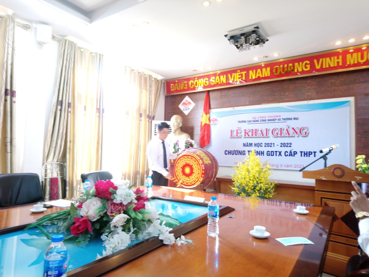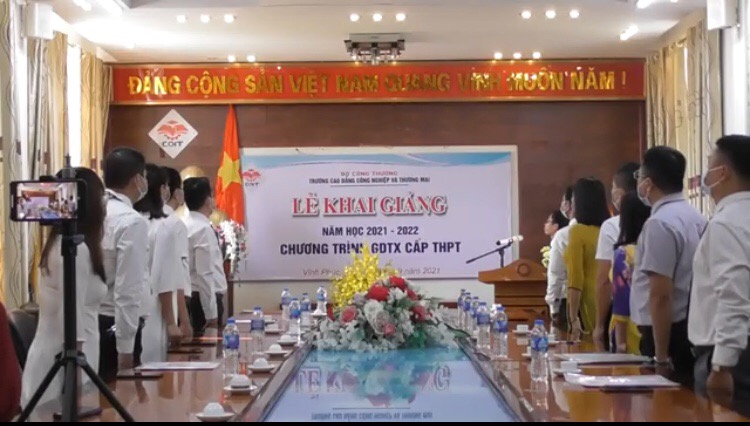Trước những diễn biến phức tạp của dịch COVID-19, Trường Cao đẳng Công nghiệp và Thương mại đã tổ chức khai giảng năm học mới 2021-2022 với hình thức trực tuyến. Chỉ một số hạn chế các đại biểu có mặt tại Trường với tình thần “5K”. Còn lại, các thầy cô giáo và học sinh tham gia thông qua các phương tiện cá nhân có kết nối internet. Tham dự buổi lễ trực tiếp tại Nhà trường có thầy Nguyễn Tiến Tùng – Bí thư đảng ủy, Hiệu trưởng nhà trường, thầy Triệu Quốc Khanh – Phó hiệu trưởng, các đồng chí là lãnh đạo một số đơn vị và cán bộ, giáo viên Trung tâm Giáo dục Trung học phổ thông của nhà trường.